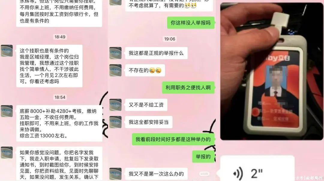 据网传图片,该招聘司理向求职者暗意,职工无谓来上班,只需挂职,且每月集团依期发工资,关联词有一定的要求,“我思通过这个挂职找个浅易情东谈主,不干预互相生存,一个月见两次傍边即可……空洞工资13000傍边......我又不是第一次这样办的”。该司理还出示了有立白字眼的工牌,称公司管事处在济南资产壹号。