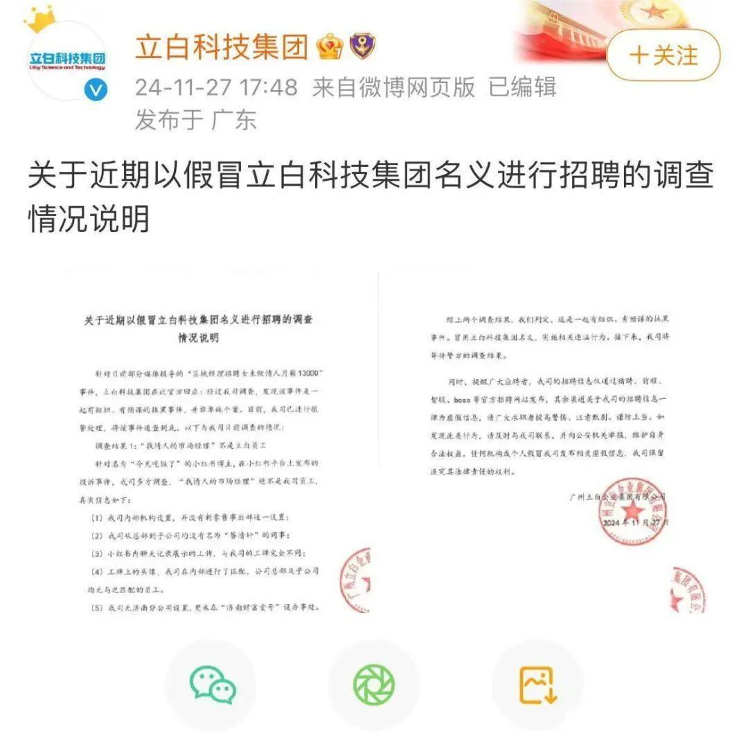立白在声明中称,经公司里面访问,自2024年6月26日于今,在快手、抖音、微信等多个平台,均出现不同IP地址的不同账号,以“立白科技集团市集崇拜东谈主”样式,发布“以高额工资招市集督导表情找情东谈主”等相通招聘信息。